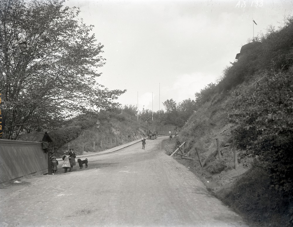 Fotografi av korsningen Tågagatan-Nyborgsvägen. Fotografiet är taget från Nyborgsvägen mot norr. Till vänster i bild, intill ett plank, står några barn och en hund. Barnen tittar mot fotografen. På Tågagatan går en pojke och bär en korg på axeln. Bakom honom syns ett ekipage med häst och vagn på väg uppför backen. I gräskanten bredvid dem befinner sig ett antal män som arbetar med något uppåt på vallen.