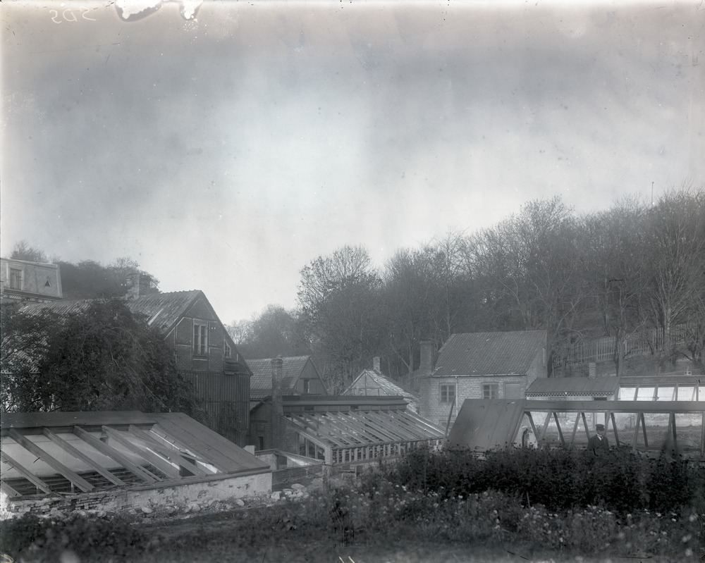 Fotografi av Jensens handelsträdgård invid Hälsovägen. Denna plats blev senare Sankt Jörgens plats. På fotografiet syns delar av trädgården med utomhusodlingar och fyra mindre växthus. I odlingen, till höger i bild, står en man. I bakgrunden syns ett antal byggnader och bakom dessa en bit av Landborgen.