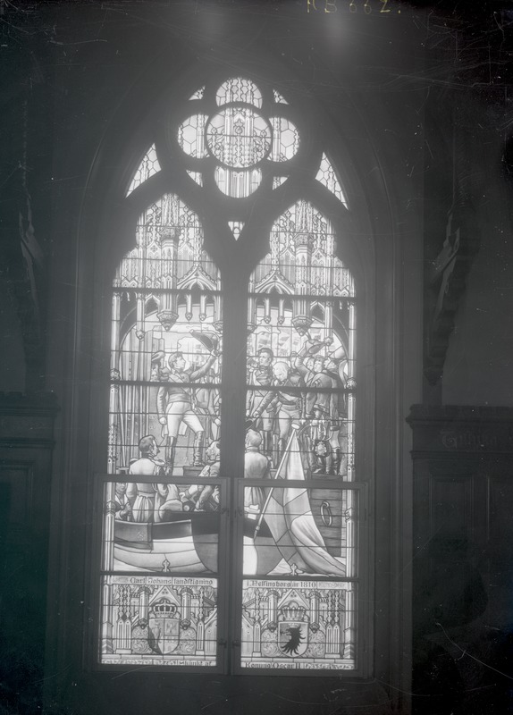 Rådhuset. Glasmålningen i fönstren, utförda efter kartongen av professorn m.m. friherre G. O. Cederström. Carl XIV Johan landstiger 1810.