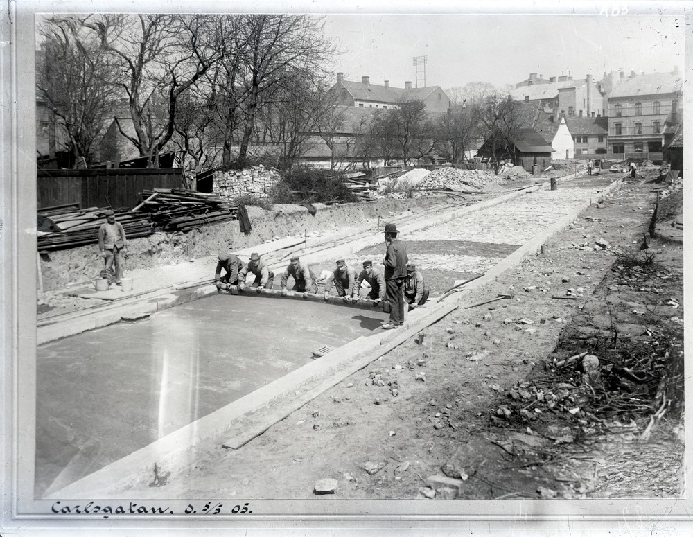 Avfotograferat fotografi som avbildar Carlsgatan under konstruktion. I bildens mitt arbetar åtta män. Till vänster finns ett plank bakom vilket det finns träd. I bakgrunden syns högar med material och stadsbebyggelse.