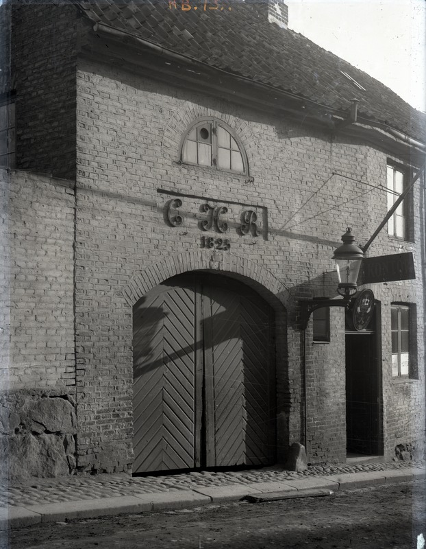 Fotografi av porten på Långvinkelsgatan 8. Ovanför porten står det "C H R 1825" i stora metallbokstäver och siffror. Brevid porten har en gatlykta monterats på husets yttervägg. Till höger om denna en öppen dörr med en skylt hängande över sig. På skylten syns någon form av emblem, det är dock oklart vilket. Ovanför denna har ytterligare en skylt monterats där det står "KONTOR". Framför byggnaden syns den kullerstensbelagda trottoaren samt en bit av gatan.