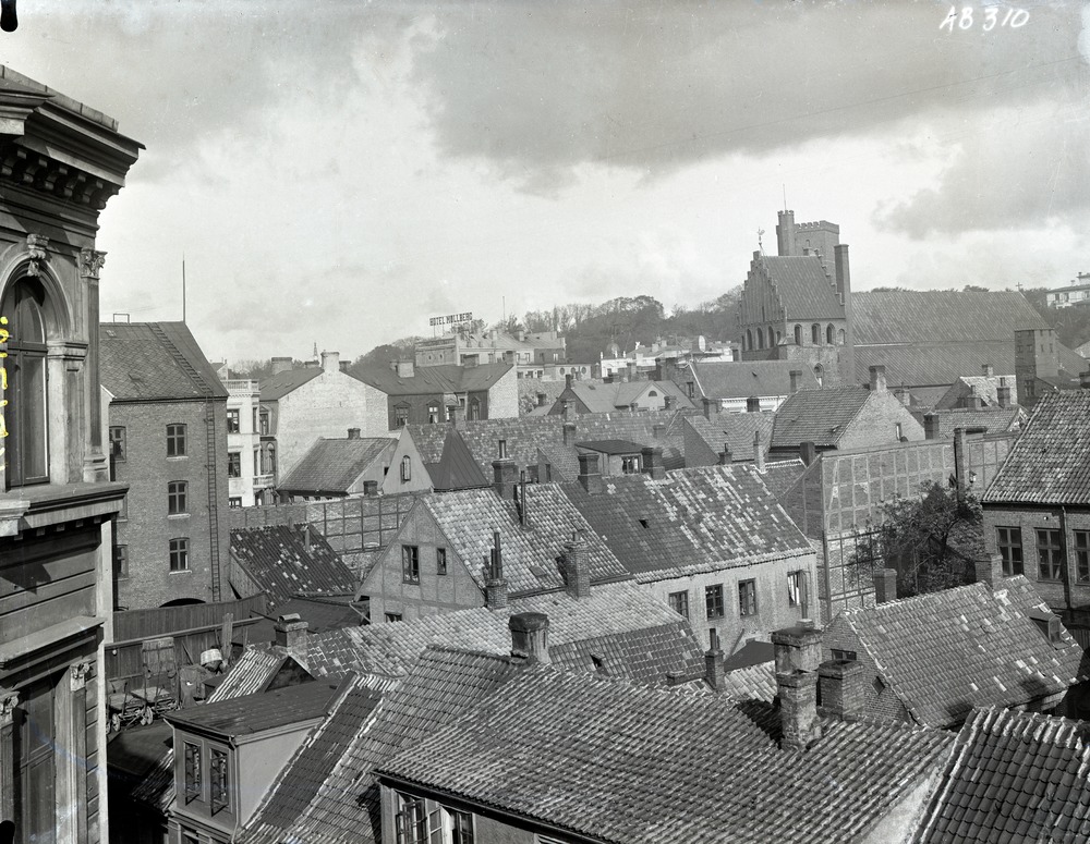 Fotografi av utsikten åt nordost från Hotel d’Angleterre. På bilden syns en stor mängd byggnader, bland annat i kvarteret Unionen. Mariakyrkan syns till höger i bild och i bakgrunden syns Kärnan och delar av Landborgen. Lite åt vänster från bildens mitt syns också Hotell Mollbergs takskylt.