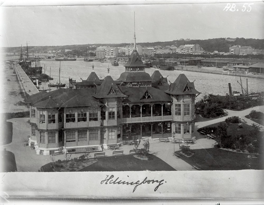 Avfotograferat fotografi av Hamnpaviljongen, Parapeten och Norra hamnen. I förgrunden ligger Hamnpaviljongen med park framför. Till höger, bakom Hamnpaviljongen, sträcker sig Parapeten norrut. Till vänster ligger delar av hamnen. Ett antal fartyg och mindre båtar är synliga. I bakgrunden syns de norra delarna av Helsingborg och Landborgen som sträcker sig vidare norrut.