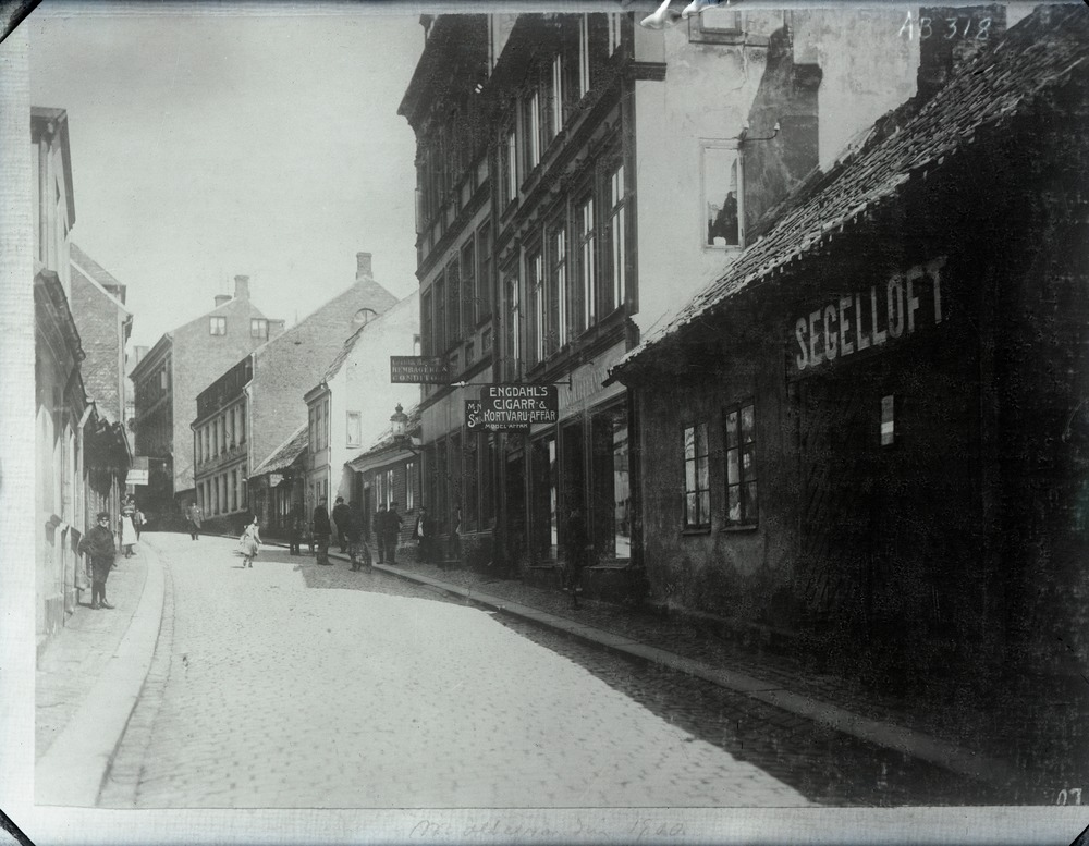Avfotograferat fotografi som visar en del av Möllegränden. I förgrunden, på gatans högra sida, finns ett enplanshus med en port. Ovanför porten står det "Segelloft". I mitten av bilden, fortfarande på höger sida gatan, syns skylten till "Engdahls Cigarr & Kortvaru-affär". Skymd bakom denna finns en skylt där enbart "Möbelaffär" är synligt. I nästa byggnad finns ett bageri och konditori, vad detta företag heter syns dåligt på skylten. Utanför bageriet står ett antal barn. Ett par av dem har cyklar. En flicka springer mot dem i mitten av gatan och på andra sidan, på gatans vänstra sida, står en pojke som tittar in i kameran. Längre upp i gatan syns fler personer, både barn och vuxna.