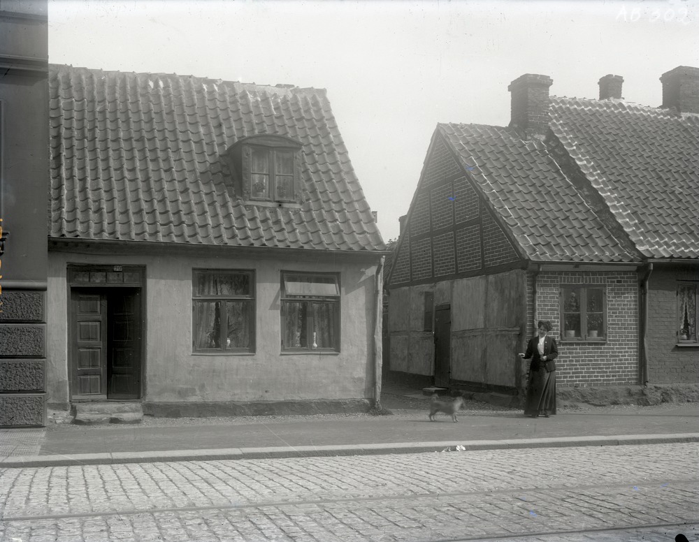 Fotografi som visar en del av Södergatan. I förgrunden syns gatan med spårvägsspår. Åt vänster i bild ligger ett litet 1,5-planshus med adressen Södergatan 79. Mellan detta hus och nästa åt höger finns en smal gränd. Nästa hus, till höger i bild, är mycket smalt och hopbyggt med nästa byggnad åt höger. På trottoaren framför gränden står en kvinna vänd mot fotografen. En bit till vänster om henne står en hund.