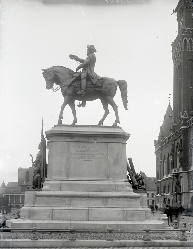 Fotografi av Magnus Stenbocksstatyn, taget åt norr. Till höger i bild ligger Rådhuset vars fasad är delvis synlig i bilden. Mellan statyn och Rådhuset syns människor röra sig längs gatan. I bakgrunden, till vänster om statyn, skymtar tågspåren som leder norrut samt en del stadsbebyggelse.
