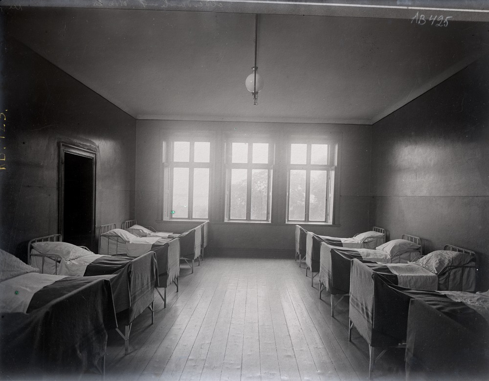 Fotografi av en sovsal på Ålderdoms- och sjukhemmet Bergalid. På bilden syns två rader med bäddade sängar som står utmed två motsatta väggar. Längst in i bild en yttervägg med tre stora fönster. På väggen till vänster finns en dörröppning. I taket hänger en lampa.