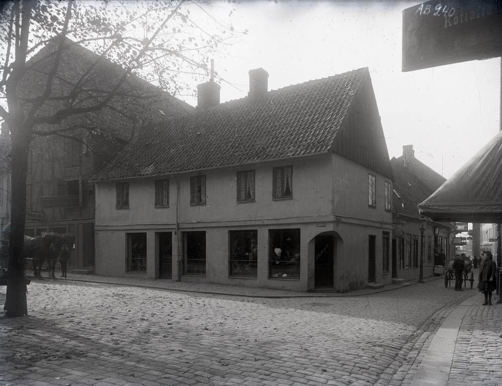Fotografi av hörnet Norra Kyrkogatan – Skolgatan. Till vänster i bild står ett ekipage med två hästar och vagn framför ett korsvirkeshus på Skolgatan. På trottoaren bredvid hästarna står en pojke. På huset sitter en skylt där det står ”Paraply & Galosch Magasinet”. I huset till höger, hörnhuset, ligger A. Bergströms blomsterhandel i den första lokalen. I lokalen på hörnet ligger vad som ser ut som en hattaffär. På dörren står det ”N.C.Svensson”. I samma hus, men på Norra Kyrkogatan, ligger Rasmussens ostaffär. Vidare ner i gatan ligger fler butiker. På den skylt som går att utläsa står det ”A. Svenssons Potatishandel”. På gatans norra sida hänger också en skylt där det står ”Hotel Mu…”, vilken troligen tillhör Hotell Munthe. På gatan syns människor röra sig. En man står vid en vagn packad med varor. En annan står med en koffert i en dörröppning. Närmst fotografen, längst till höger i bild, står en ung kvinna som ser ut att titta bort mot hästekipaget på Skolgatan.
