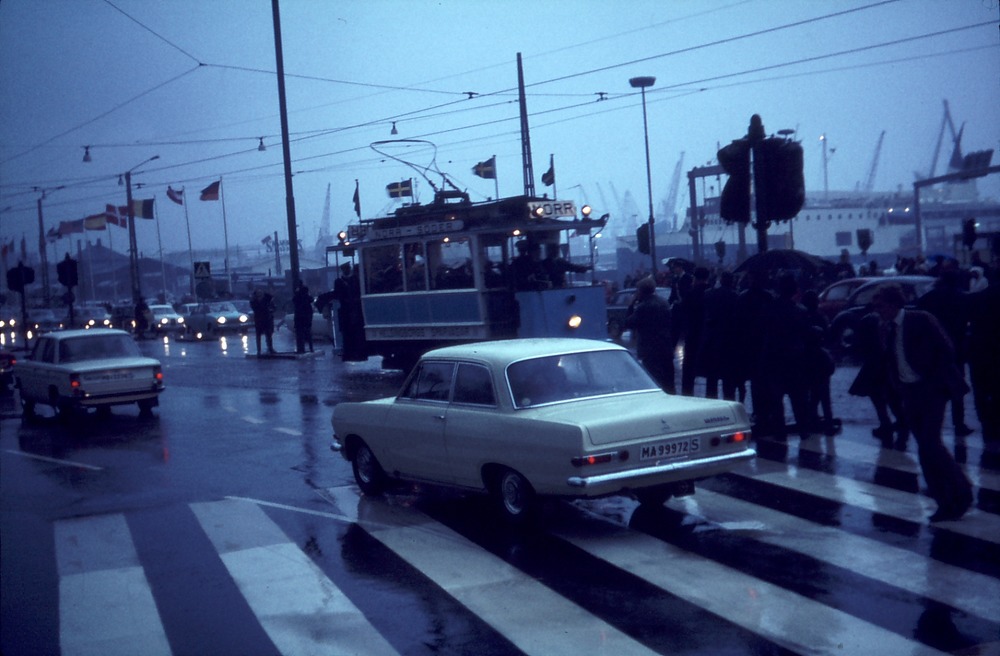 Fotografi taget i samband med högertrafikomläggningen 1967. På bilden syns den trafikerade Järnvägsgatan, samt ett övergångsställe i förgrunden. Människor med jackor och paraplyer står och väntar på att gå över. Bredvid gatan går spåvägen med en spårvagn i bild. I bakgrunden på bilden syns hamnen med kranar och fartyg.