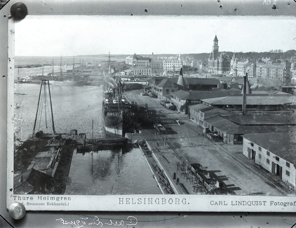 Fotografi taget av Carl Lindquist som avfotograferats. Fotografiet visar utsikten norrut från varvet i Helsingborg. Delar av hamnområdet samt delar av centrum och norr syns. Till höger syns Landborgen och kuststräckan norrut mot Kullahalvön. Det avfotograferade fotografiet är monterat på papper. Längst ner på pappret finns tryckt "Thure Holmgren (fd. Svenssons Bokhandel.)" följt av "HELSINGBORG." och "CARL LINDQUIST Fotograf".