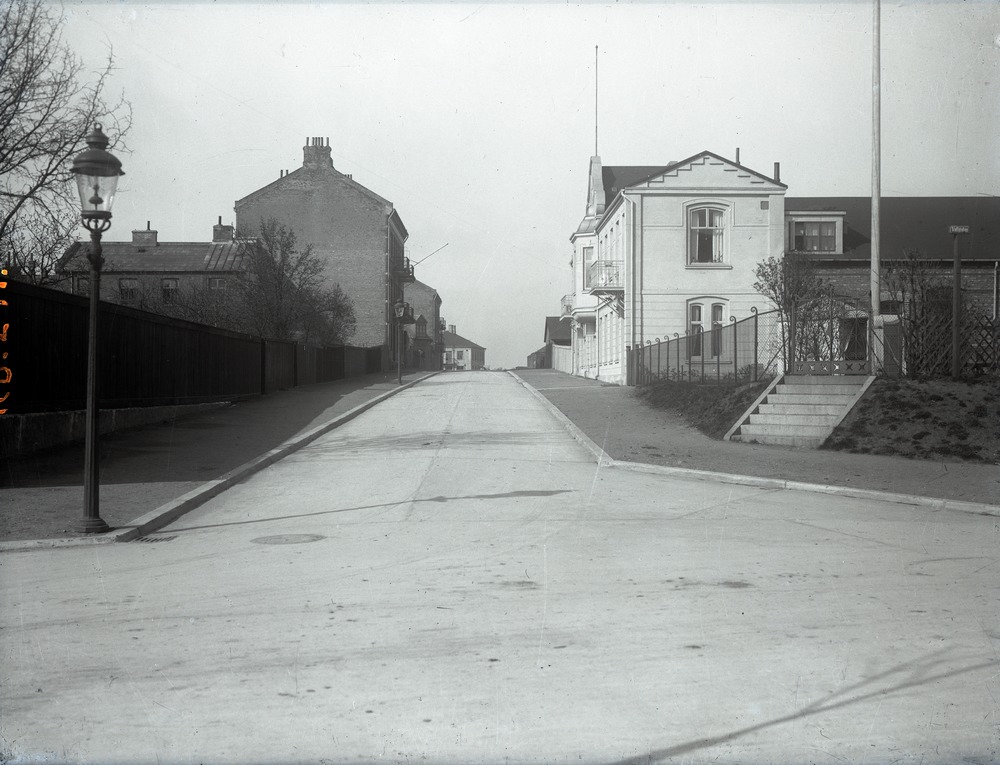 Fotografi av Hebsackersgatan taget från det som förr hette Vallgatan. Denna gata blev senare en del av S:t Peders gata. Hebsackersgatan löper genom mitten av bilden. På gatans vänstra sida finns ett långt plank. Där bakom syns ett flertal träd och en byggnad i tegel. På den grusade trottoaren står två gatlyktor. Vid planket slut finns ett flervåningshus. Vidare skymtar fler byggnader längs gatan. På gatans högra sida leder en trappa upp från trottoaren till en grind som är en del av en inhägnad runt en, något upphöjd, trädgård. Vidare syns ett antal byggnader längs gatan.