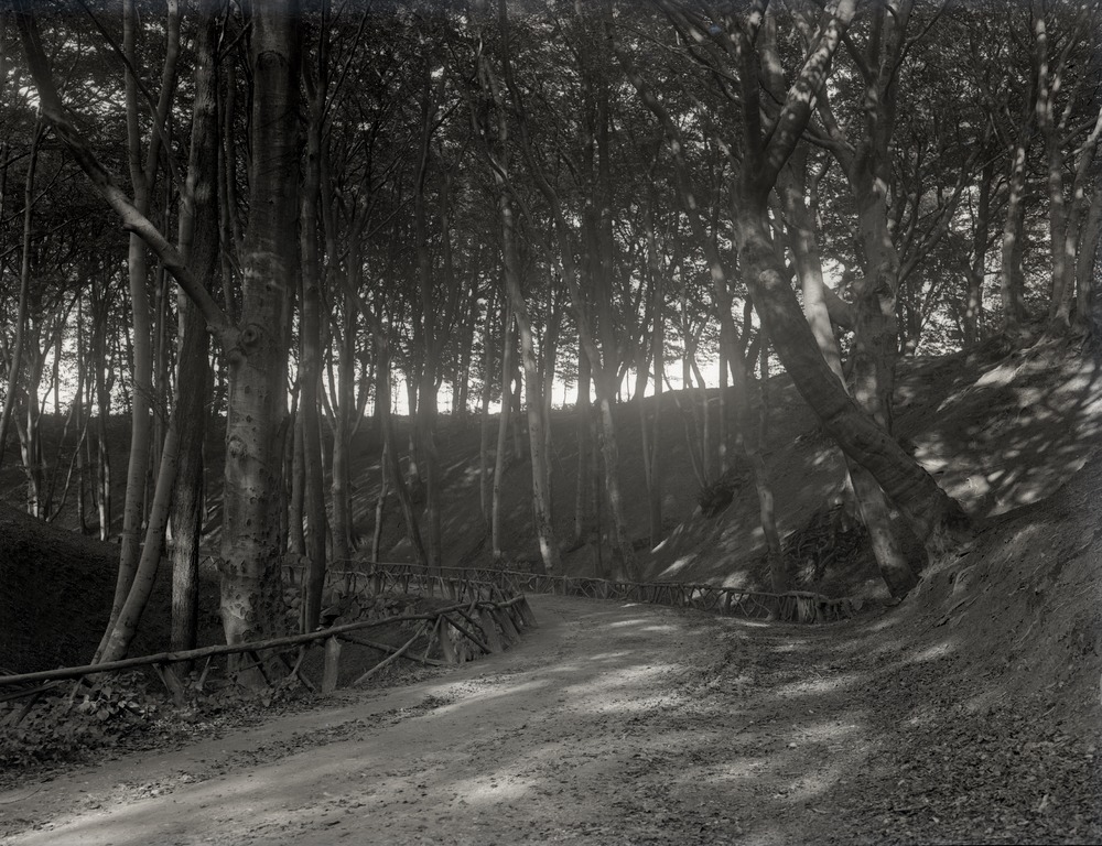 Fotografi av Gustaf Hoffs väg genom Pålsjö skog. Vägen, som gör en vänstersväng genom bilden, är omgärdad av ett lågt staket som ser ut att vara gjort att grenar och stockar. På vägens båda sidor är landskapet kuperat och täckt av lövträd.