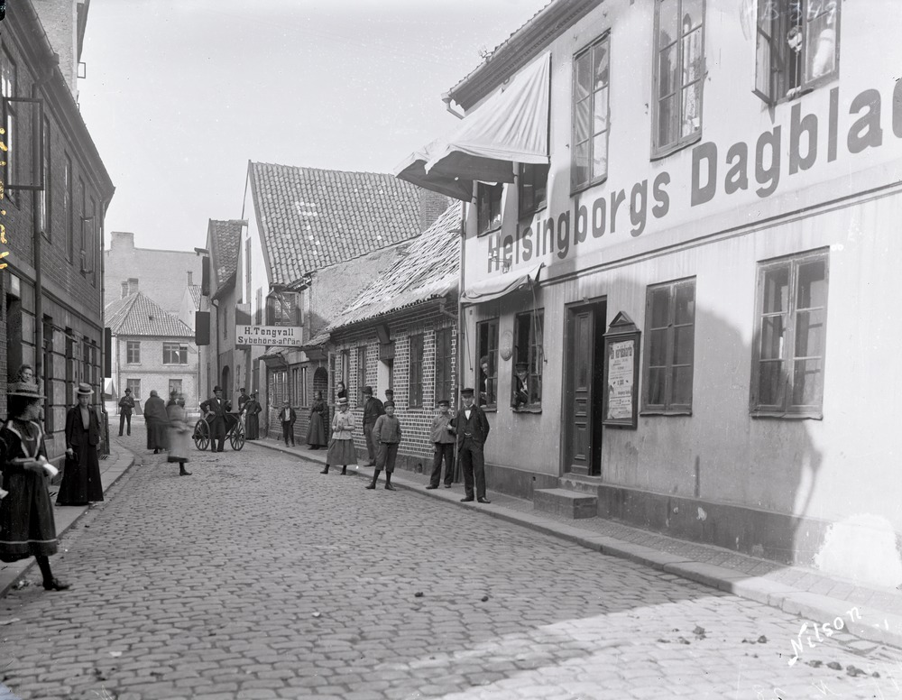 Fotografi av Norra Strandgatan taget åt norr. Till vänster i bild, på gatans västra sida, är en kvinna på väg att gå ut på gatan. Bakom henne på trottoaren, intill en husfasad, står två kvinnor som tittar mot fotografen. På motsatta sida ligger byggnaden som vid tiden inrymde Helsingborgs Dagblad. Denna byggnad ligger på hörnet Norra Strandgatan – Kolmätaregränden. I ett öppet fönster på andra våningen, och i två på bottenvåningen, tittar tre personer ut mot fotografen. Längre ner på gatan hänger en skylt ut över trottoaren där det står ”H. Tengvall Sybehörs-affär”. På gatan och trottoaren står och går ett flertal personer. Många av dem tittar mot fotografen. En man står lutad mot en vagn mitt i gatan.