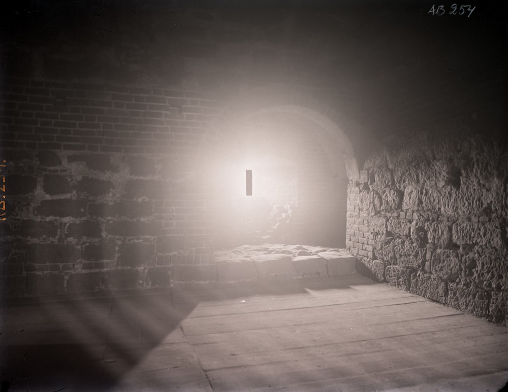 Fotografi som visar en del av interiören på Kärnans andra våning. På bilden syns ett hörn där det finns ett valv som leder till en skottglugg. Solen lyser in skarpt genom gluggen. Trägolvet syns i förgrunden.