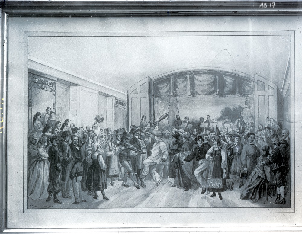 Fotografi av C. Callmanders målning från 1867 med titeln "Hantverkarnas bal på Mollberg 1867".
