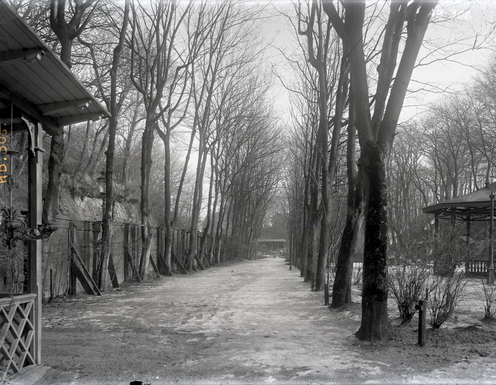 Fotografi som visar en del av Hälsan i Hälsobacken. Till vänster ligger en kulle med nakna träd. Nedanför den löper en allé, med ett promenadstråk, inåt i bilden. Det ligger lite snö eller frost på marken. Mellan allén och kullen finns ett plank. I förgrunden, på vänster sida, syns en liten del av en träbyggnad med veranda. Till höger om allén ligger en paviljong. I bakgrunden syns fler träd och ytterligare några byggnader skymtas.
