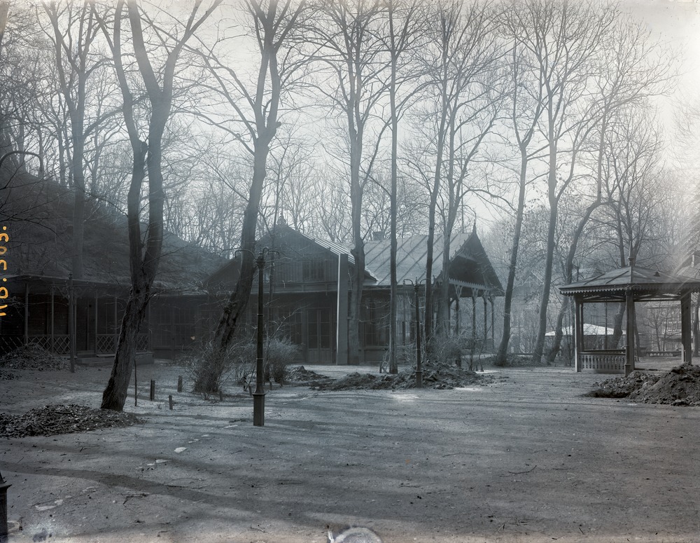 Fotografi som visar en del av Hälsan i Hälsobacken. Till vänster i bild syns en kulle täckt av nakna träd. Nedanför den ligger två träbyggnader. Den längst till vänster har platt tak medan den andra ser ut att vara ett 1,5-planshus. Båda byggnaderna har verandor på framsidan. Till höger i bild står en mindre paviljong i trä. I förgrunden grusad mark. Här har några hål grävts i marken och jordhögarna ligger kvar intill dem. I bakgrunden syns fler träd samt ytterligare några byggnader.