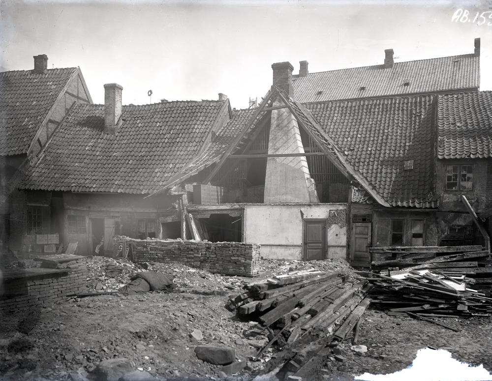 Fotografi av rivning av byggnader i kvarteret Carl XI. I förgrunden ligger rivningsrester, virke och tegelstenar på innergården. Bakom bråten står fyra ihopbyggda hus som är under rivning. Bakom dessa, på andra sidan gatan, syns taket av en betydligt högre byggnad.