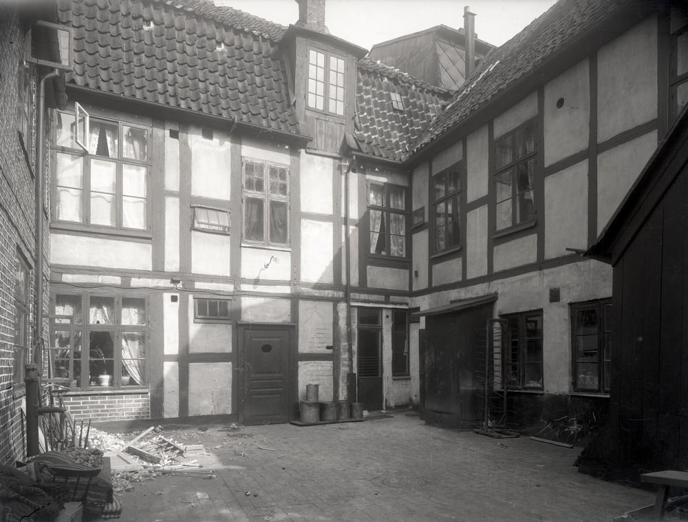 Fotografi av gårdsinteriören på Kullagatan 13. Gårdsplanen omgärdas av två ihopbyggda 2,5-plans korsvirkeshus och en tegelbyggnad. Gården är belagd med tegel. Till vänster, mot tegelbyggnadens vägg, står en vattenpump och en cykel samt en mängd skräp.