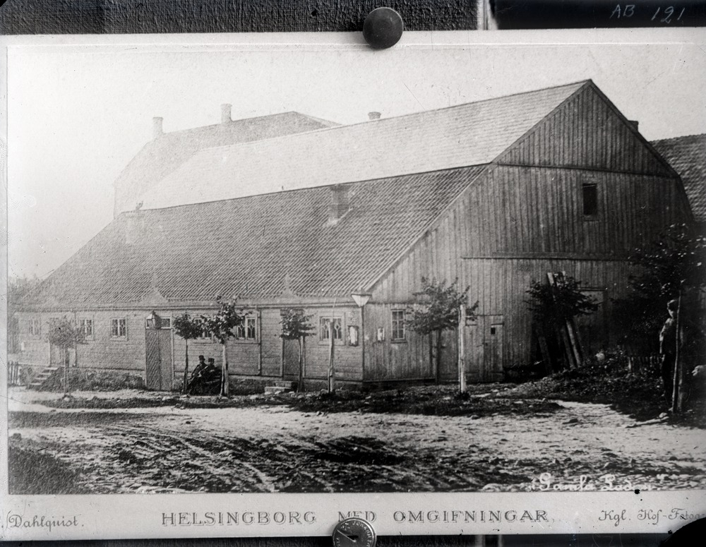 Avfotograferat fotografi. Originalet är fotograferat av Carl Dahlquist. På bilden syns den så kallade Teaterladan på Prästgatan. Små träd ser ut att nyligen ha planterats framför och bredvid byggnaden. Vid trädet längst till höger i bild står en man vänd mot byggnaden. På en bänk framför byggnadens fasad sitter ytterligare två män. I bakgrunden syns ett par andra byggnader. Originalet är troligen fotograferat efter att byggnaden flyttats ett antal meter under 1850-talet och innan den revs under 1870-talet.