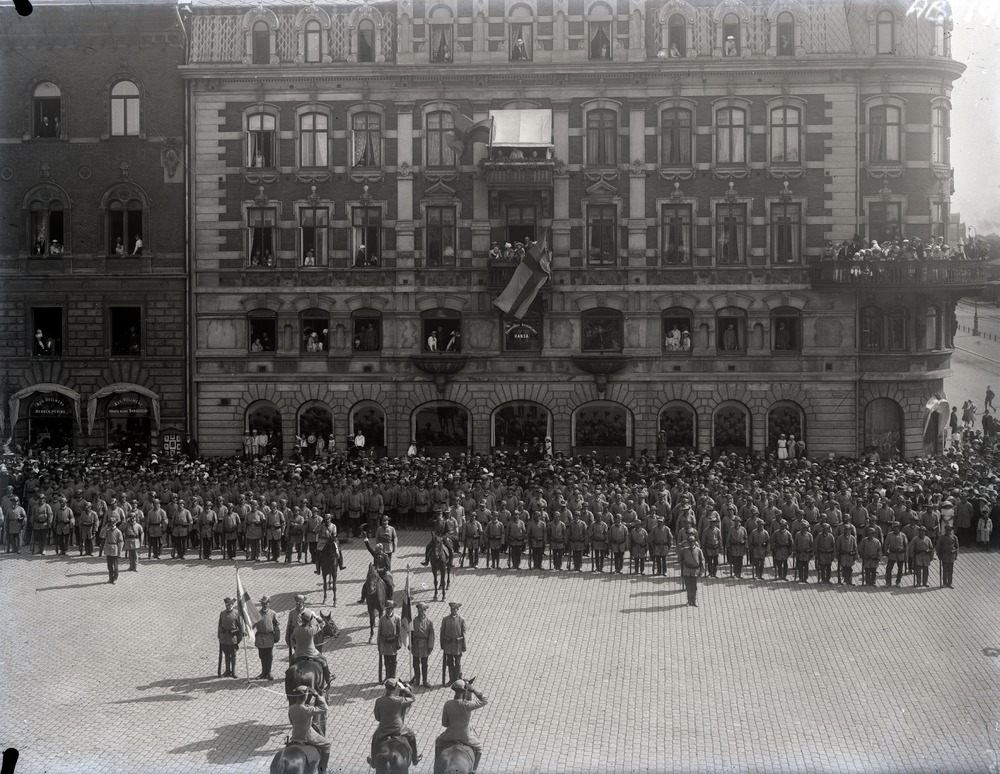 Fotografi, taget åt söder från Rådhuset, av Landstormskorum i augusti 1914. På torget, framför Centralpalatset och byggnaden bredvid till vänster i bild, står militärer till fots och till häst. Bakom dem, precis intill husväggarna, står en stor samling åskådare. I fönster och på balkonger ovanför finns också åskådare. Från en av Centralpalatsets balkonger hänger svenska flaggan.