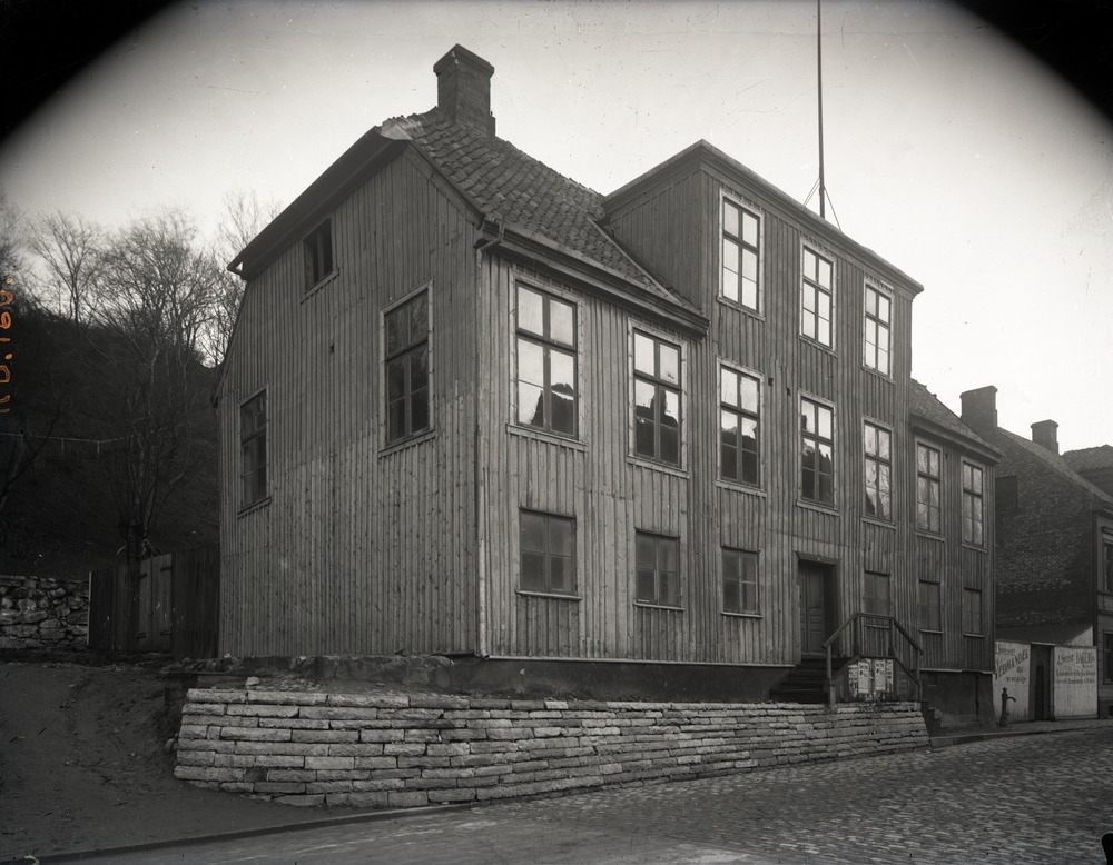 Fotografi av Tornérhjelmska huset. Fotografiet är taget från andra sidan gata, åt sydost. I förgrunden syns den stenlagda gatan. Framför huset, åt vänster i bild, löper en stenmur. En trappa, förlagd på trottoaren, går upp till huvudingången som är förlagd till husets mitt. Bakom huset, till vänster i bild, syns ett plank som leder in på baksidan. Träd på Landborgens sluttning syns också på baksidan. Till höger om huset löper ett vitt plank med någon form av reklamtext. Därefter skymtar grannhuset.