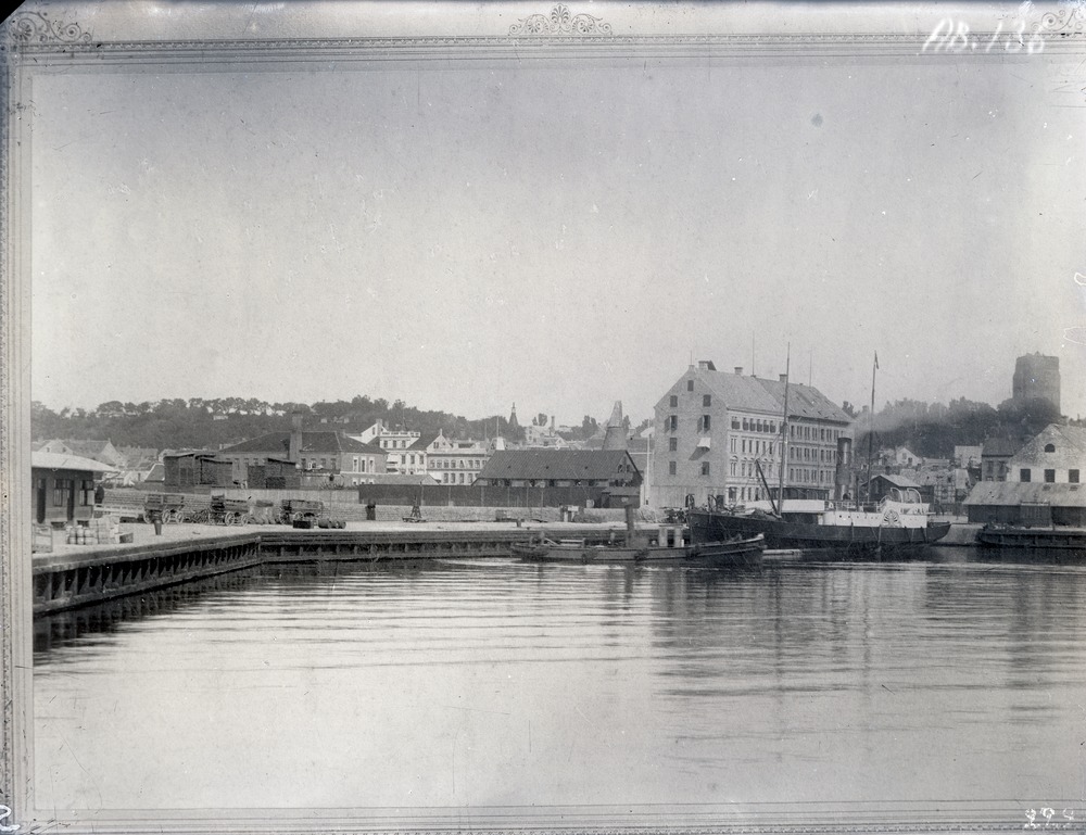 Avfotograferat fotografi taget från hamnen i nordöstlig riktning in över staden. Ett par fartyg syns i hamnen. Bakom dem breder staden ut sig och i bakgrunden, täckt av träd, syns delar av Landborgen och Kärnan.