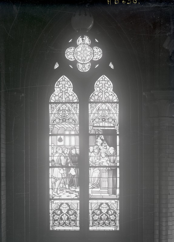 Rådhuset. Glasmålningen i fönstren, utförda efter kartongen av professorn m.m. friherre G. O. Cederström. Erik XIII förnyar Helsingborgs privilegier 1415.