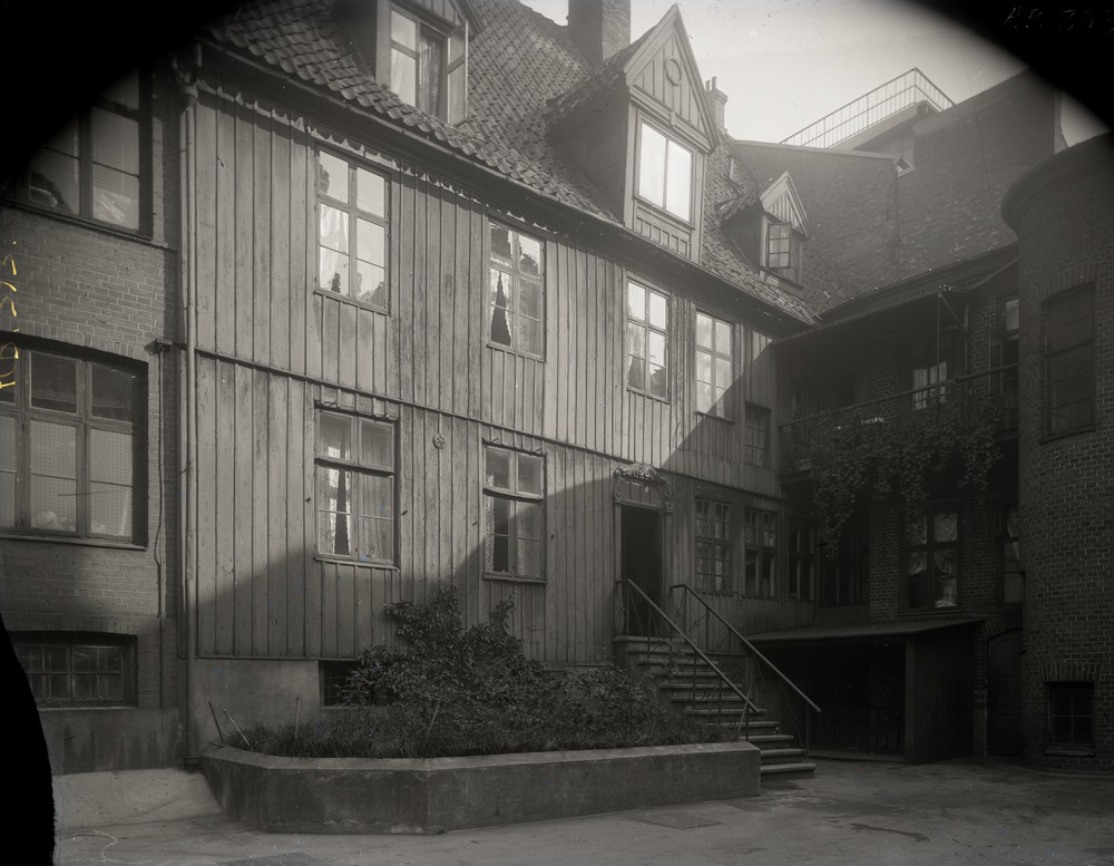 Fotografi av Gamlegård på Norra Storgatan, sett från innergården. Huset är här klätt i träpanel. Till vänster om trappan som leder upp till ingången en halv våning upp finns en upphöjd rabatt med bland annat någon form av klätterväxt. Mellan trappan och tegelbyggnaden till höger finns ett litet skjul. På tredje våningen finns en balkong varifrån klätterväxter hänger ner.