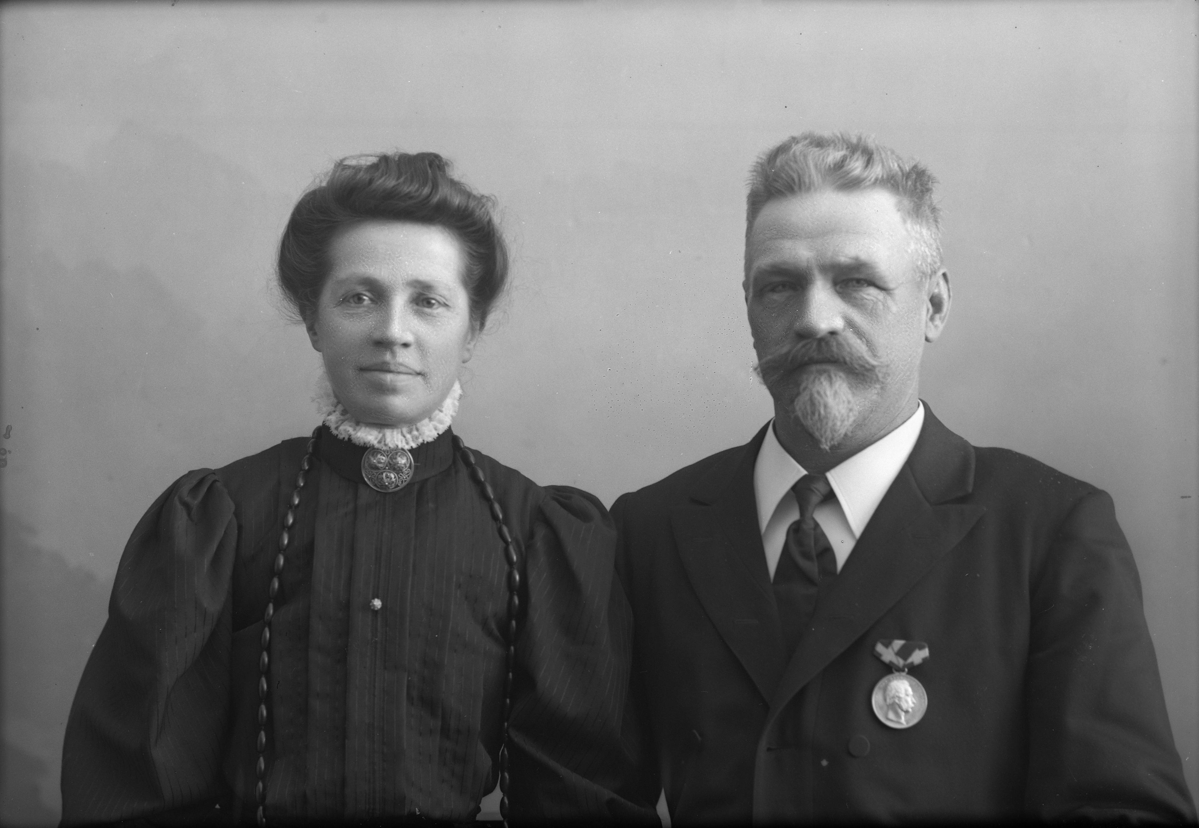 Beskrivning: Porträtt i halvfigur av herr Wahlgren med fru.