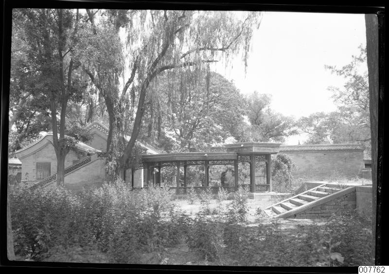 Del av trädgård. Ett galleri leder fram till en större byggnad.