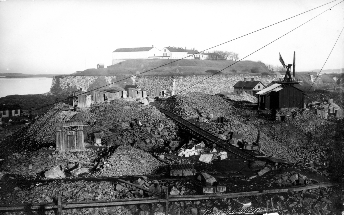 Stenbrottet söder om Varbergs fästning. Linor korsar luften över stenbrottet med arbetsbodar och räls för godsvagnar.