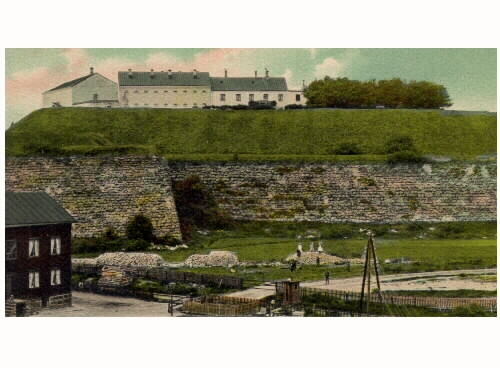 Kolorerat vykort. Utsikt mot fästningen med vallgraven i förgrunden. T v uppe på fästningsvallen står den sista kanonen på fästningen. Den flyttades till Påskberget 1898.