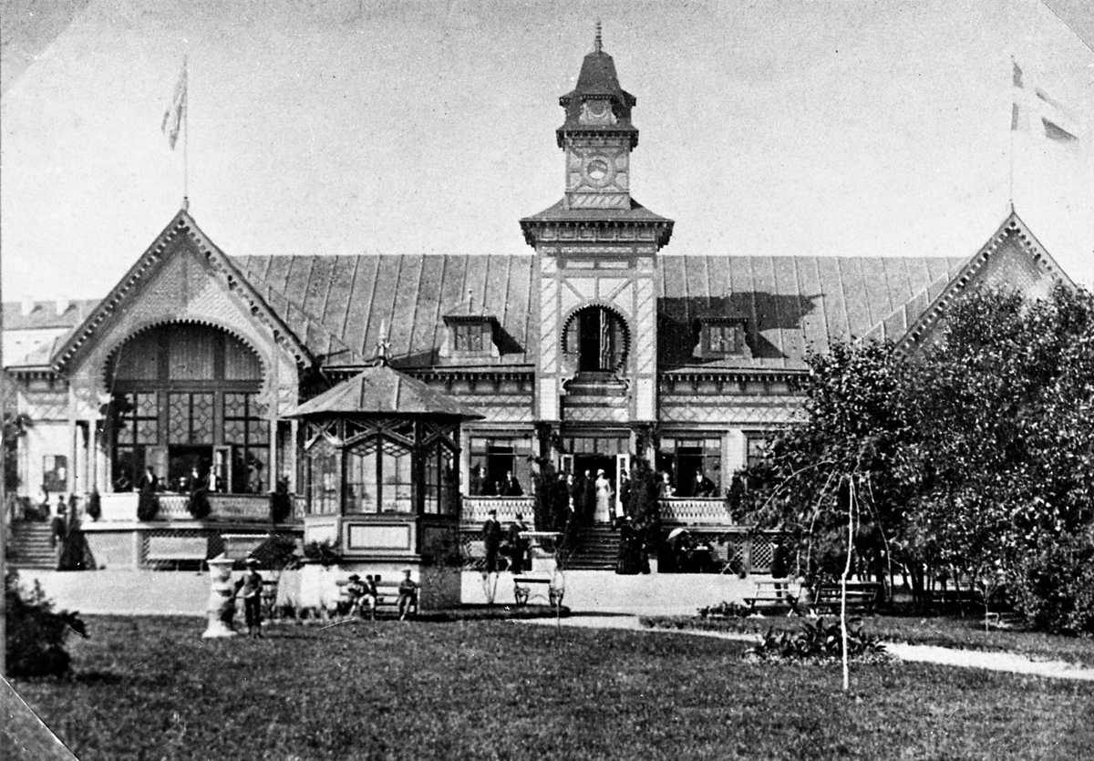 Societetsrestaurangen i Varberg som nybyggd, utan det skärmtak som byggdes till längs fasaden 1884. Rikt utsmyckad i morisk stil med mönster och utsirningar. I förgrunden står en liten paviljong som kan ha varit till solskydd eller för ett mindre musikkapell. Många personer på verandorna och kring paviljongen, både vuxna och barn.