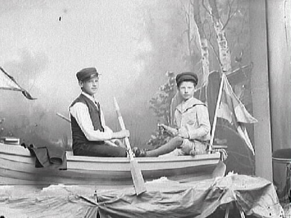 Ateljéfoto. Fotografens bror till vänster sitter med kamraten Erik Gustafsson i en rekvisitabåt och håller i en åra. Beställare av bilden var Erik Gustafsson, möjligen kamratens far.
