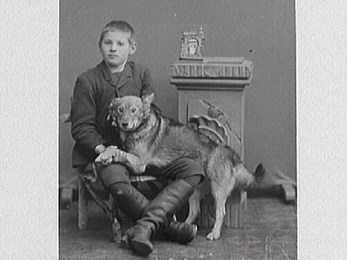 Pojkporträtt. Troligen fotografens yngste bror Erik Ranch med hund i knät. Omkring mitten av 1880-talet.