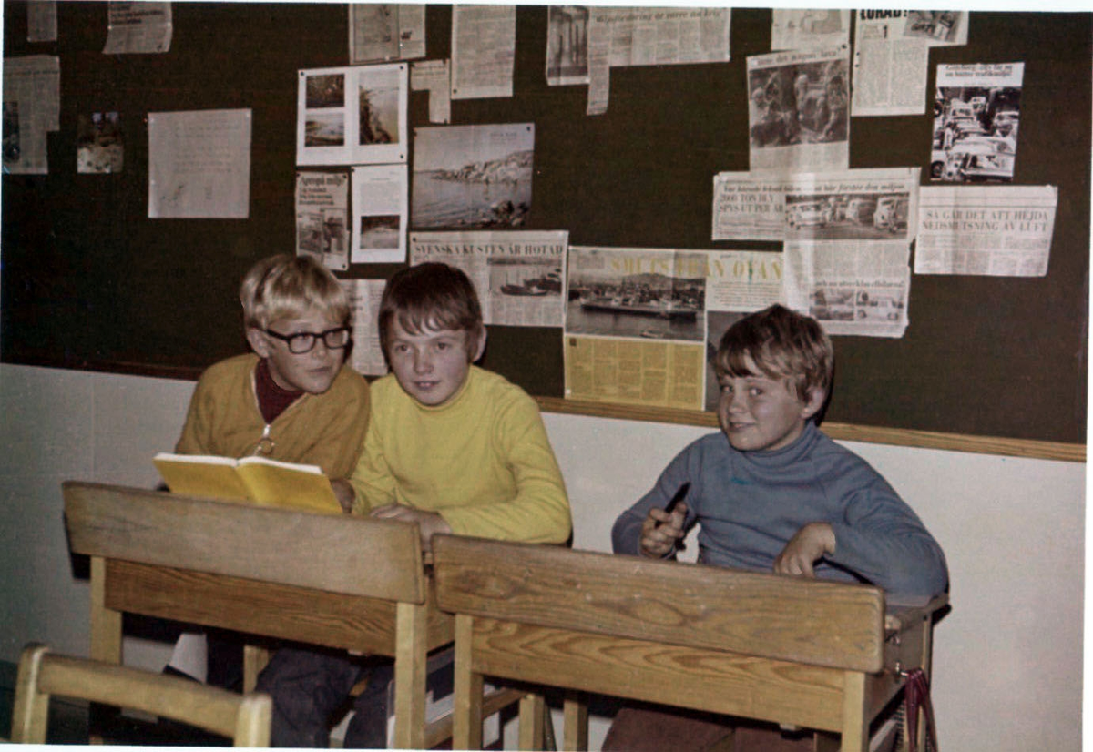 Tre elever (pojkar) sitter vid sina bänkar i en skolsal på Brattåsskolan, 1980-tal.