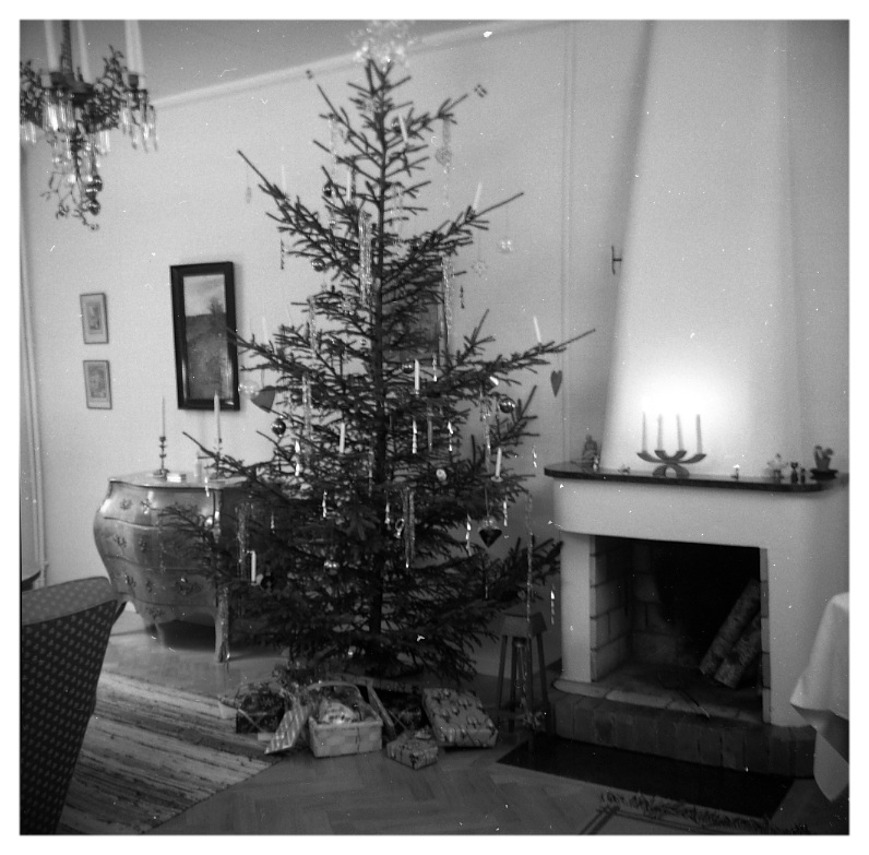 En klädd julgran i familjen Svanbergs hem på Södra Kyrkvägen 10 "Villa Gläntan" 1950-tal. Där bodde Nils och Helga Svanberg med döttrarna Ingrid och Ulla från mitten av 1930-talet.