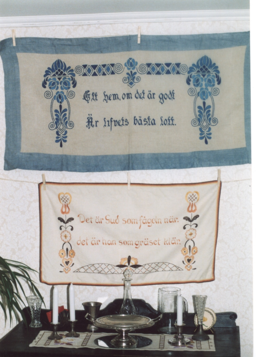 Två väggbonader visas från en bonadsutställning i Vommedal Västergård "Hanses" på Streteredsvägen 7, cirka år 2000. Arrangörer var: SV Mölndal, Mölndals Hemslöjdsförening och Kållereds Hembygdsförening.