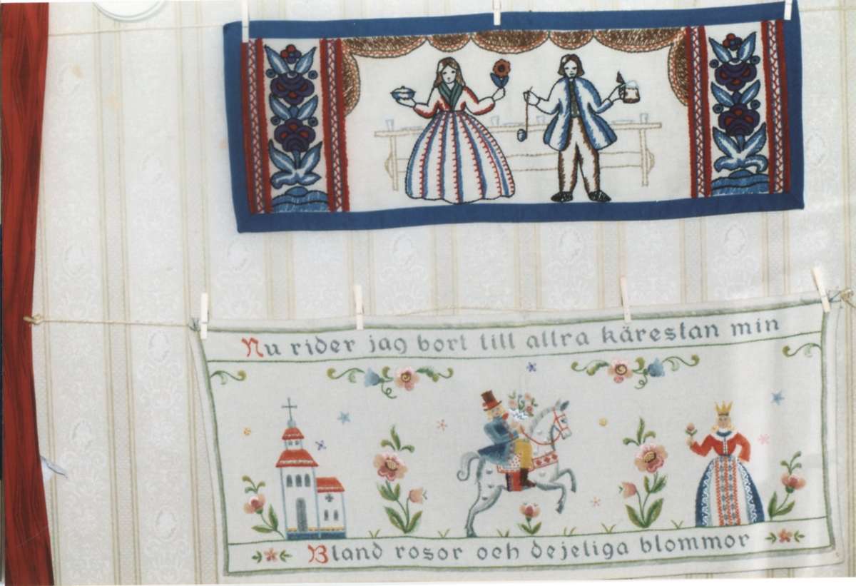 Två väggbonader visas från en bonadsutställning i Vommedal Västergård "Hanses" på Streteredsvägen 7, cirka år 2000. Arrangörer var: SV Mölndal, Mölndals Hemslöjdsförening och Kållereds Hembygdsförening.