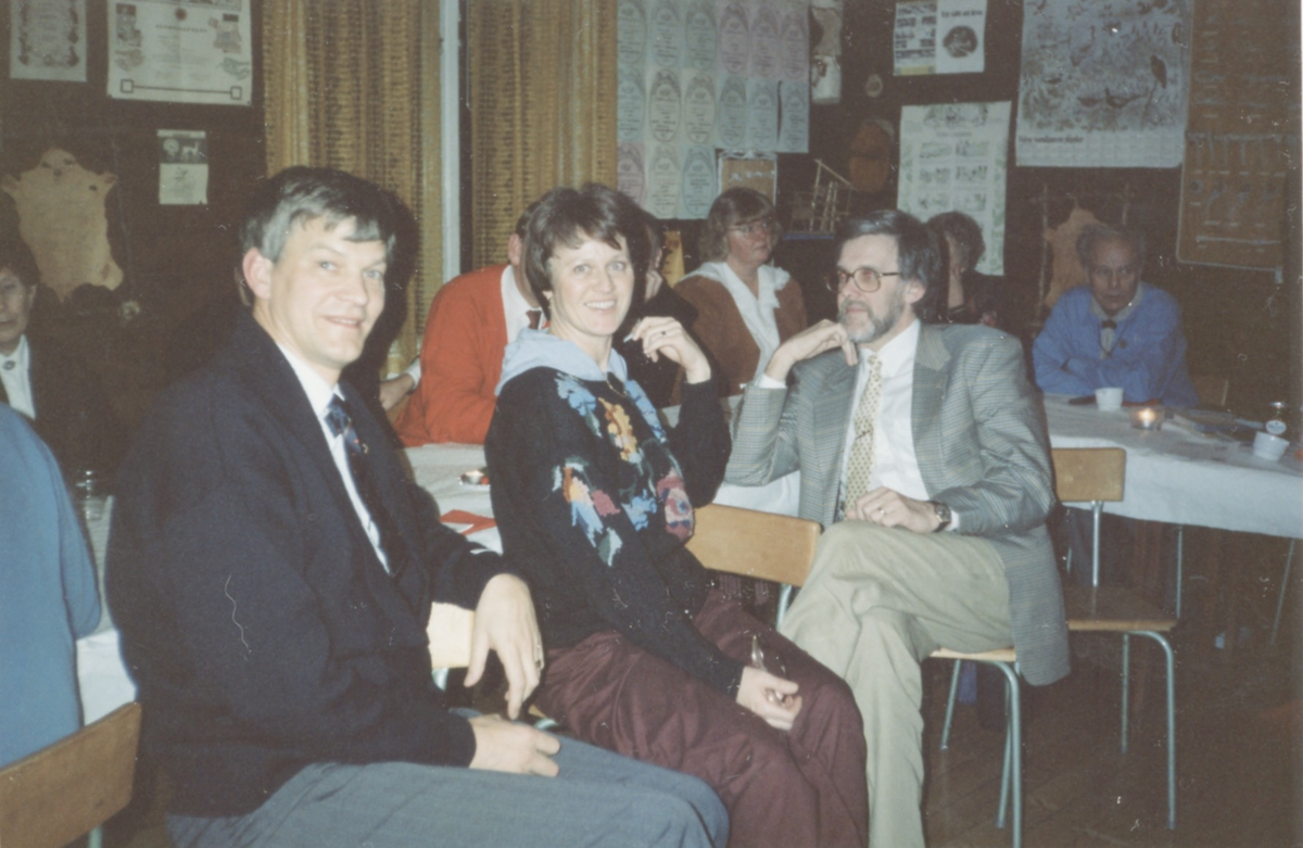 NTO-scouter i Scoutstugan på Enevägen i Kållered, 1980-tal. Sittande från vänster: 1. Bert Karlsson, Lindome. 2. Gun Eriksson Paterson. 3. Ove Andersson, Lindome.