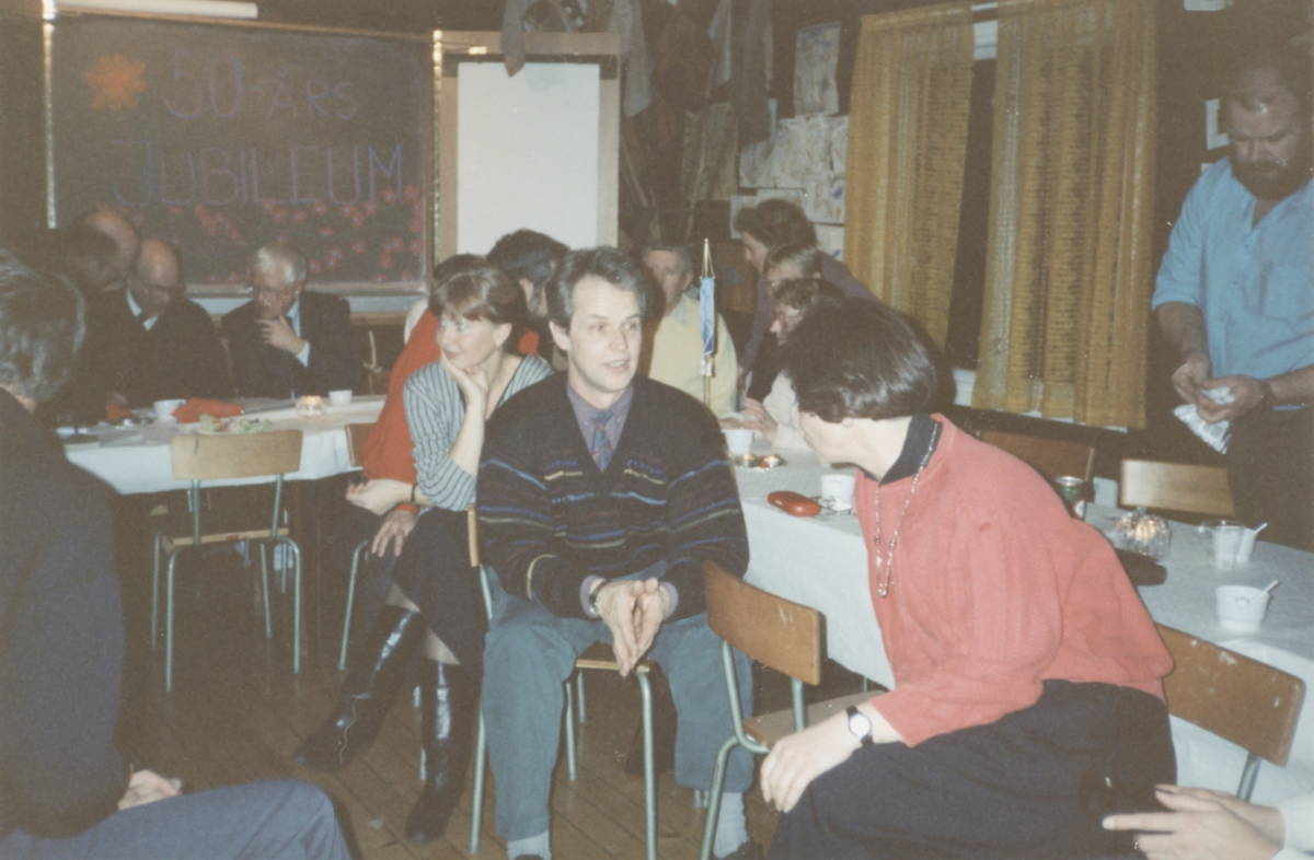 NTO-scouternas 50-årsfest i Scoutstugan på Enevägen i Kållered, 1980-tal. De tre främsta från vänster: 1. Birgitta Eriksson Svensson. 2. Berndt Larsson. 3. Margareta Skansing. Längst till höger står Ingemar Johansson.