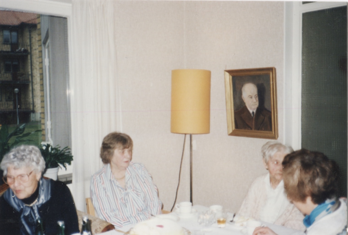 Maria "Maja" Nilsson (1903 - 1989) uppvaktas på Lackarebäckshemmet 1988 när hon fyller 85 år. Från vänster: 1. Astrid Eriksson. 2. Okänd kvinna. 3. Maja Nilsson, 85 år. 4. Okänd kvinna.