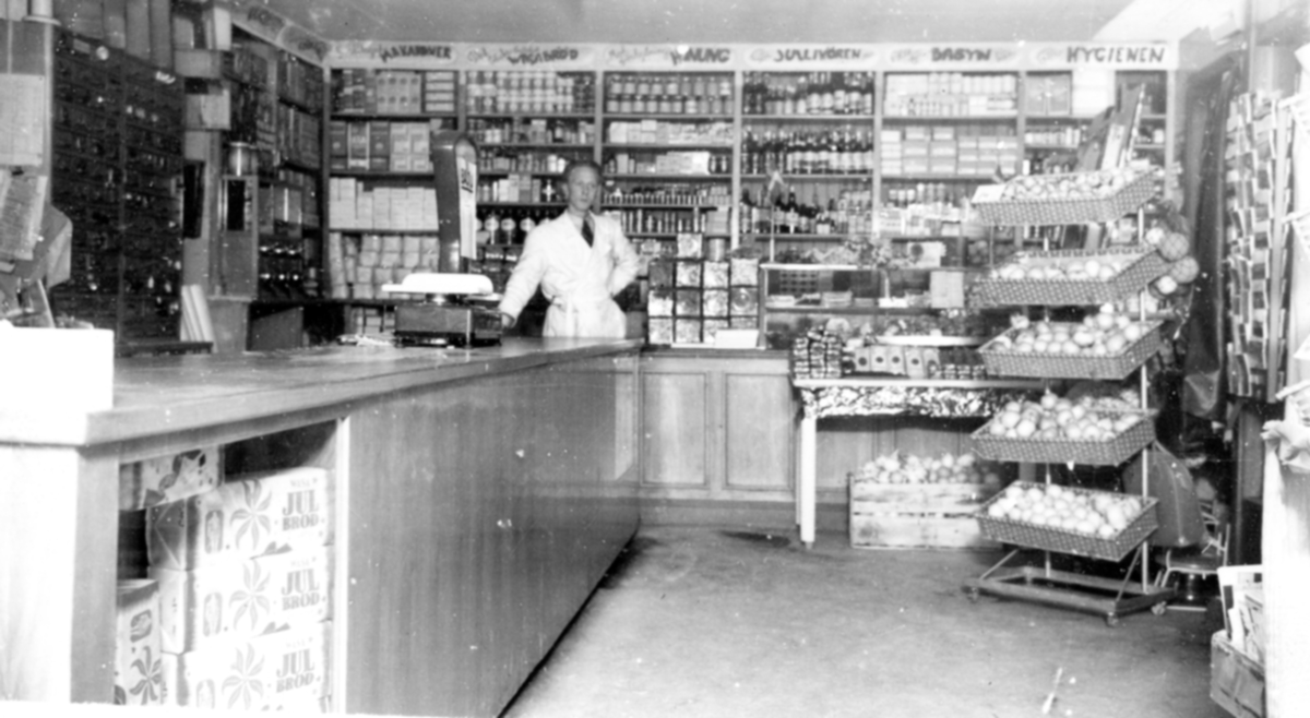 Hans Pettersson står bakom disken i Lindgren & Petterssons lanthandel "Mariedal" Vommedal Östergård 2:12 (i dag: Våmmedal 2:12) 1940-tal. Affärshus/handelsbod på Gamla Riksvägen 42, uppfört cirka 1905. HP ägda lanthandeln tillsammans med Pelle Lindgren, som senare övertog verksamheten på egen hand.