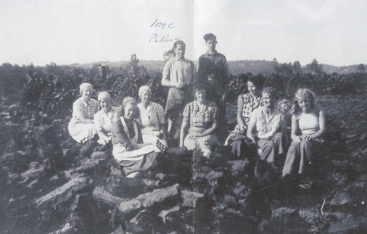 Torvupptagning vid Tulebo under andra världskriget 1939 - 1945, under Götaverkens ledning. Stående från vänster: 1. Inge Pettersson. 2. Okänd man. Sittande från vänster: 1. Ingrid Talinsson (gift Bengtsson), Hultet. 2. Elsa Pettersson, Tuleboäng. 3. Okänd. 4. Olga Helgesson, Tulebo. 5. Hulda Helgesson, Tulebo (svägerska med nummer 4). 6. Okänd. 7. Hildur Nilsson, Tulebo. 8. Skymd. 9. Ingrid Aspelin Carlsson.