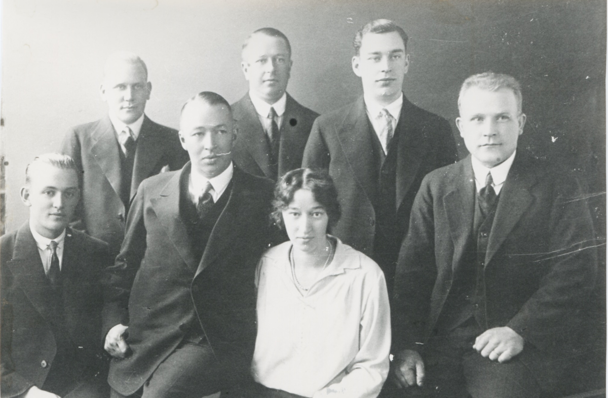 Affärsanställda vid Bröderna Pettersson Skrädderi & Herrekipering fotograferas vid ett 10-årsjubileum år 1933. Från vänster: 1. George Danielsson, Mölndal (son till Sandor Danielsson). 2. Bertil Olsson, Torrekulla. 3. Thor Pettersson. 4. Per Pettersson. 5. Greta Pettersson. 6. Sven Pettersson. 7. Henry Olsson, Vommedal. Nr 3 - 6 är syskon.