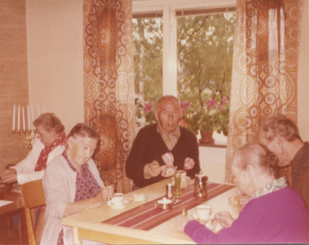 Fikastund för de boende på Brattåshemmet 1970-tal. I bakgrunden sitter en kvinna bredvid en sjuarmad ljusstake. Närmast sitter, från vänster: 1. Selma Börjesson, Högkullen. 2. Okänd man. 3. Okänd kvinna i lila tröja. 4. Okänd man.