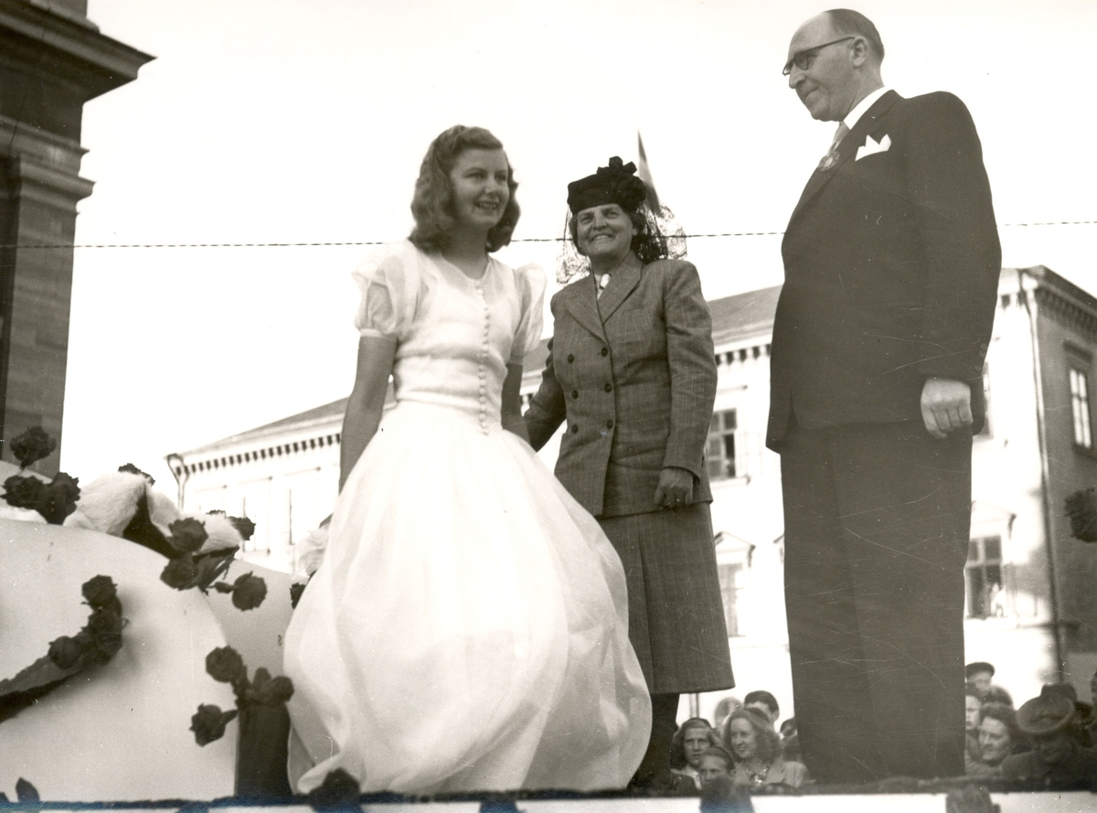 Bankdirektör Sjöberg med fru och Barnensdagsprinsessan på Stortorget i Kalmar omkring 1950.