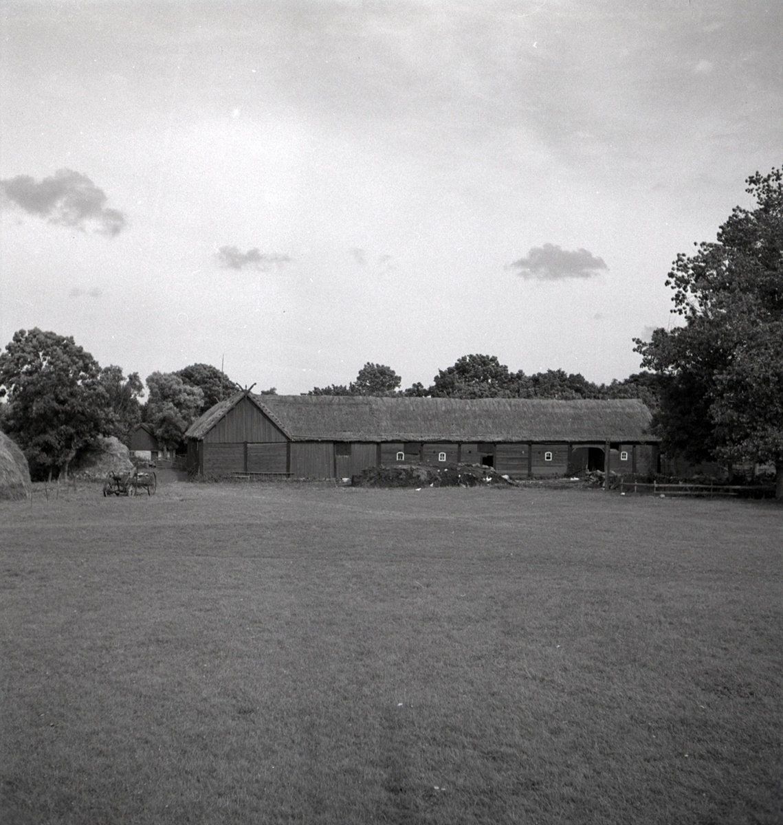 Bild som visar en ladugård någonstans i Kalmar län. Den är byggd i skiftesverk och har halmtäckt tak. Dyngan ligger öppet utanför ladugården.