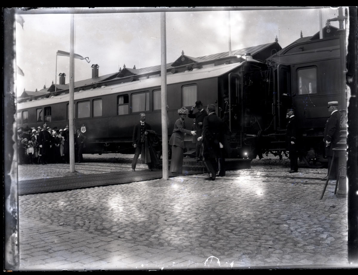 Drottning Victoria av Baden, Gustav V:s gemål, besöker Kalmar. Bredvid står poliser i pickelhuvor och håller åskådare på behörigt avstånd.